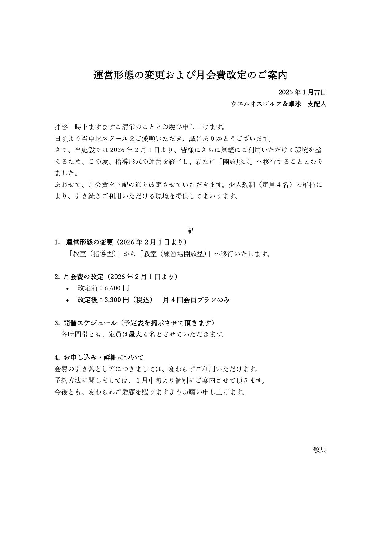 日頃よりウエルネス卓球教室をご愛顧いただき、誠にありがとうございます。